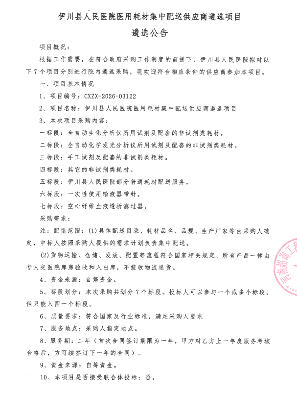 伊川县人民医院医用耗材集中配送供应商遴选项目遴选公告