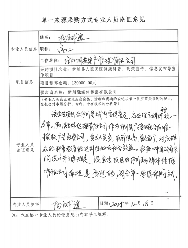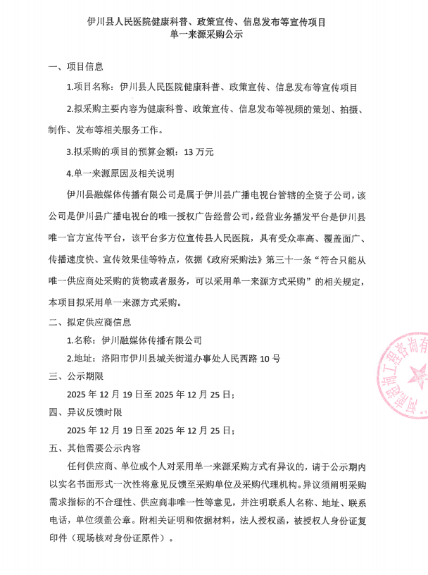 伊川县人民医院健康科普、政策宜传、信息发布等宣传项目单一来源采购公示