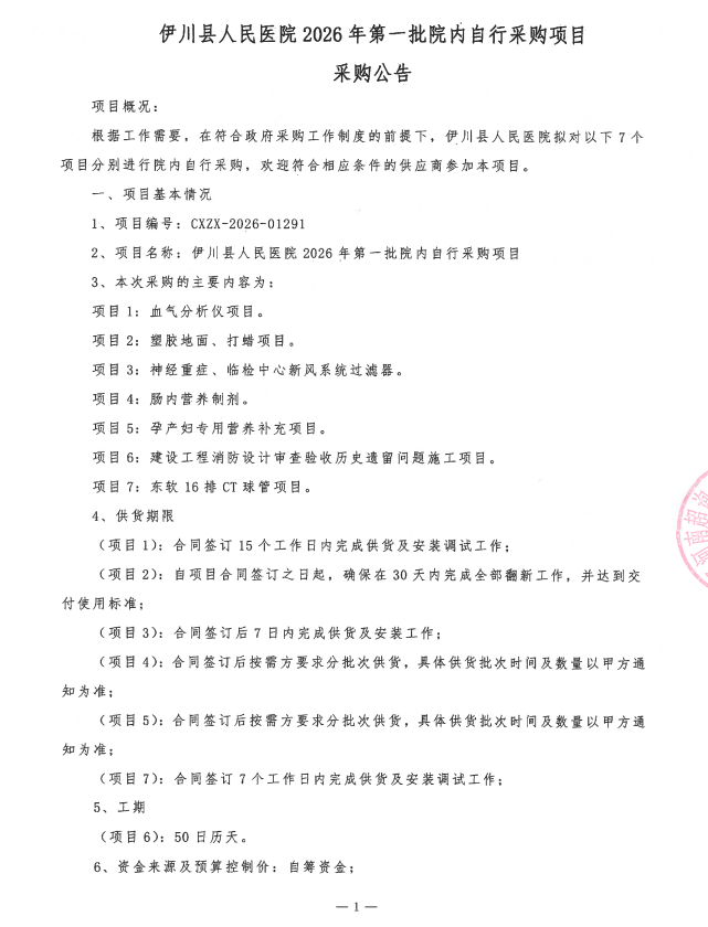 伊川县人民医院2026年第一批院内自行采购项目采购公告
